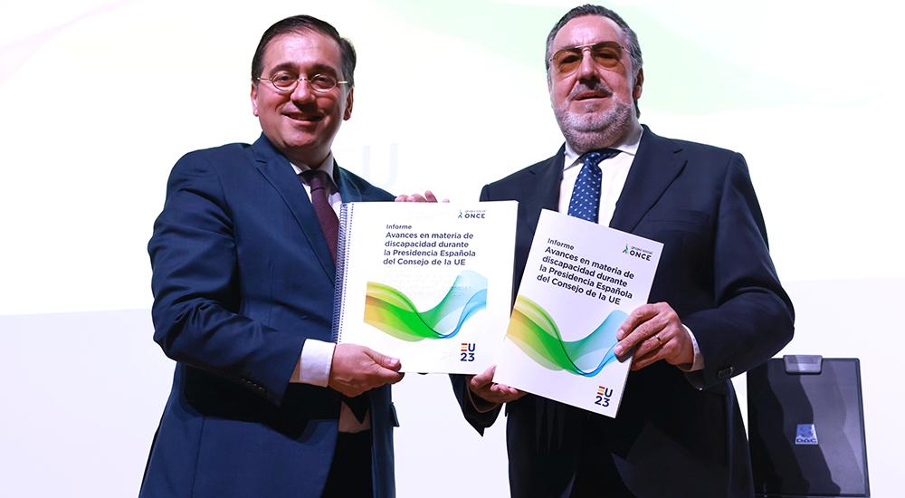 El Grupo Social ONCE presentó, en la sede del Ministerio de Asuntos Exteriores, el informe sobre los avances en materia de discapacidad durante la Presidencia Española de la Unión Europea. Al acto asistió el ministro de Asuntos Exteriores, Unión Europea y Cooperación, José Manuel Albares, quien recibió de manos del presidente del Grupo Social ONCE, Miguel Carballeda, un ejemplar del informe en tinta y en braille.
